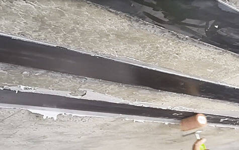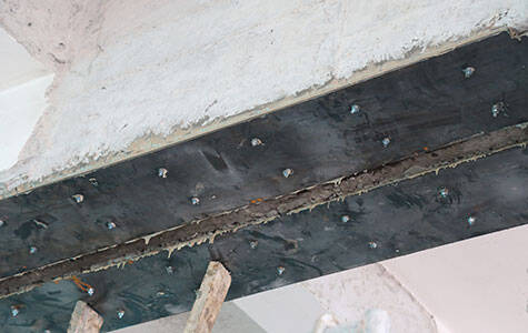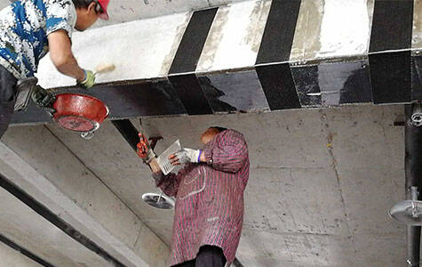 Les ouvriers utilisent de la colle époxy pour coller de fines plaques de PRFC sur les poutres, puis appliquent une couche de colle époxy pour les renforcer. La durée de vie du pont après construction est estimée à environ 50 ans.
