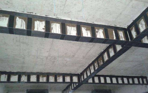 Pour les fissures dans les poutres en béton d'une largeur de 0,2 mm, outre l'injection sous pression de résine époxy selon les deux méthodes, du PRFC est collé pour sceller la surface. Les poutres en béton armé sont renforcées par des plaques de PRFC à la base de la travée médiane.